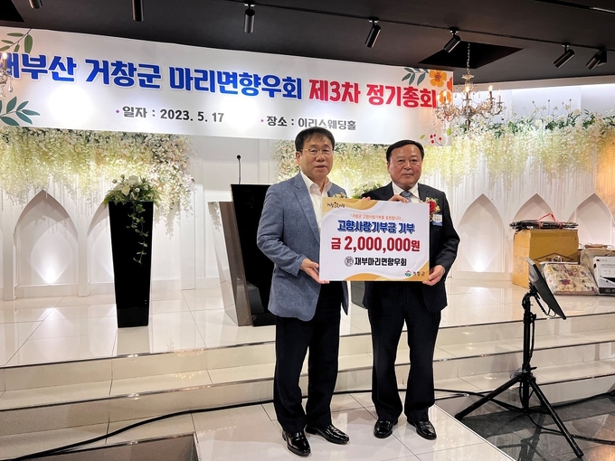 김광수 회장(영진수산 대표)은 "고향인 거창군과 마리면의 발전을 위해 회원 모두 기쁜 마음으로 기부금을 모아 전달하게 됐다"라면서 "앞으로도 고향에 보탬이 될 수 있도록 향우회에서 관심을 가지고 지원하겠다"라고 전했다.