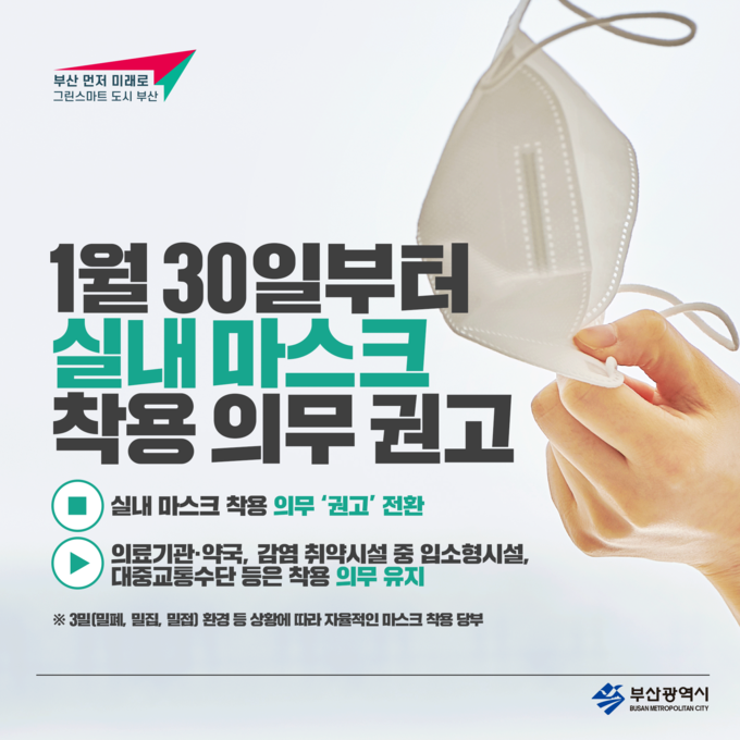 [경남도민뉴스] 부산시(시장 박형준)는 오는 1월 30일부터 마스크 착용 의무화 행정명령을 변경 발령하고, 실내마스크 착용을 ‘의무’에서 ‘권고’로 전환한다고 밝혔다.