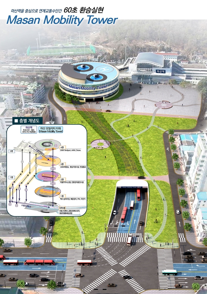 창원시가 계획하고 있는 ‘마산역 마스 스테이션’은 ‘마산역을 중심으로 연계 교통수단간 60초 환승 실현’을 목표로 하나의 건물 내에서 철도·버스·트램과 UAM·자율차·PM 등 미래 모빌리티간 유기적인 연계와 환승이 가능하도록 했다.