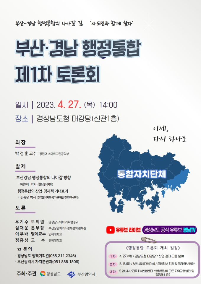 부산시와 경남도는 이날 1차 토론회를 시작으로 다음 달 15일 부산, 24일 진주에서 토론회를 개최하여 행정통합에 대한 각 분야 전문가의 의견을 듣고 시도민의 의견을 청취하는 논의의 장을 이어갈 예정이며, 관심 있는 시도민은 누구나 참여할 수 있다.