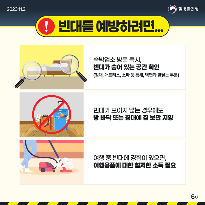 빈대 발생 신고가 접수되면 관련 부서와 보건소 기동방역반이 현장에 출동해 빈대 출현 여부 확인, 위생상태 점검, 전문방제업체 안내, 방제 지원을 하고 재출몰 여부를 관리한다.
