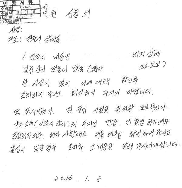 민원인 A씨 등은 지난 1월 8일 진주시청 해당과와 민원실을 방문해 ‘진주시 내동면 ○○리 ○○번지 일원에서 불법산지전용과 불법개발행위를 통해 ○○ 목적으로 이용되고 있고, 동 사업자가 진·출입시설로 사용 중인 국가소유의 도로부지가 불법 점용된 것으로 생각돼 이를 확인하고 조치하여 줄 것을 요청’하는 민원을 제기했다.