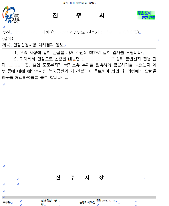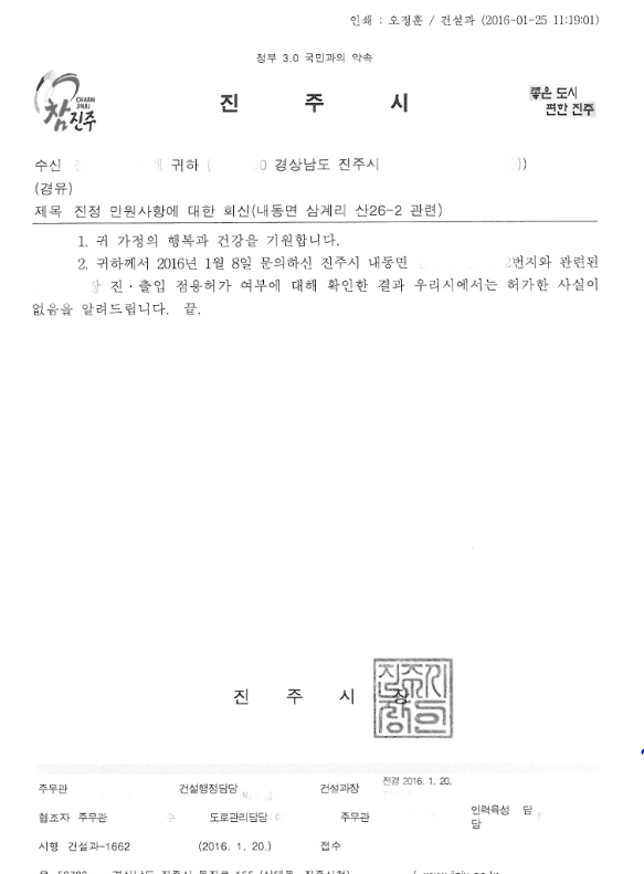 | 진주시 건설과에서 민원인에게 회신한 공문 |