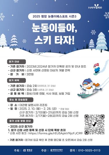 [경남도민뉴스=표재민 기자] 평창군과 재단법인 평창유산재단은 오는 2월 10일부터 2월 28일까지 알펜시아 리조트에서‘2025 평창 눈동이 패스포트 시즌 3’ 프로그램을 진행한다.