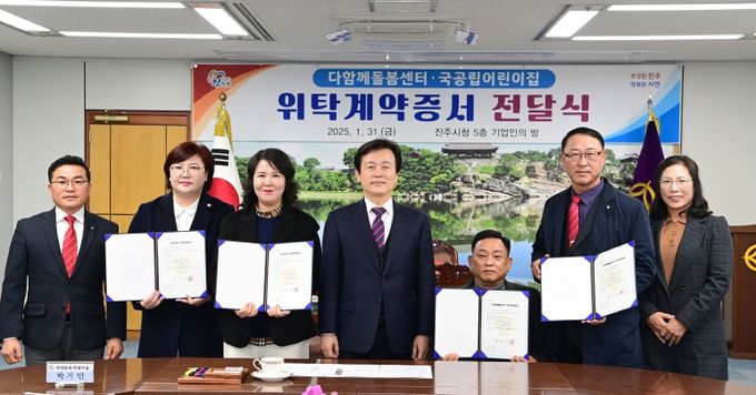 [경남도민뉴스=권중환 기자] 진주시는 31일 시청 기업인의 방에서 다함께돌봄센터 2개소 및 국공립어린이집 2개소 수탁운영자와 위탁계약증서 전달식을 가졌다.