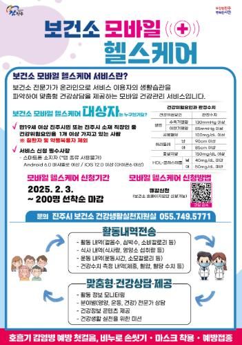 [경남도민뉴스=권중환 기자] 진주시보건소는 2월 3일부터 2025년 모바일 헬스케어 사업 참여자 200명을 선착순으로 모집한다.