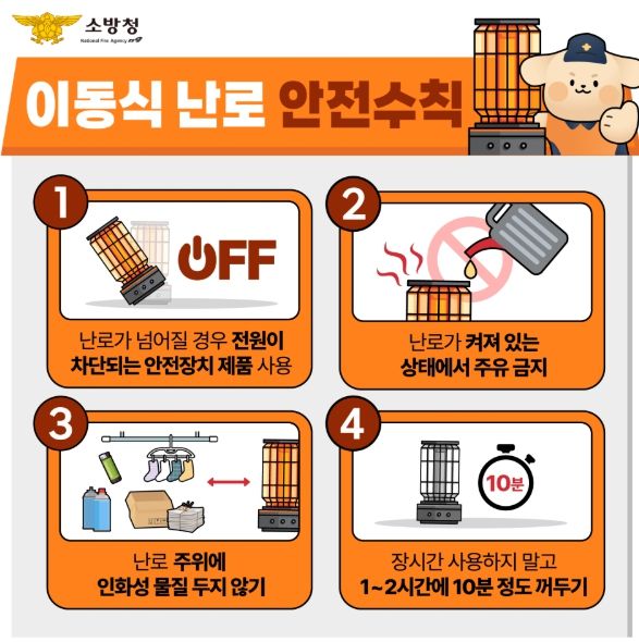 소방청 통계에 따르면 최근 5년간(’20~’24년) 다중이용업소 화재는 총 1,948건으로 화재 발생 건수 대비 인명피해 비율은 다중이용업소가 9.3%로 일반건축물 6.2%에 비해 약 1.5배 높게 나타났다. 따라서 화재예방과 피해를 최소화하기 위해 영업주들이 자발적으로 이동식 난로 사용자제에 동참해 주기를 바란다고 밝혔다. 다만 부득이하게 사용할 경우 아래 안전수칙을 지켜줄 것을 당부한다.