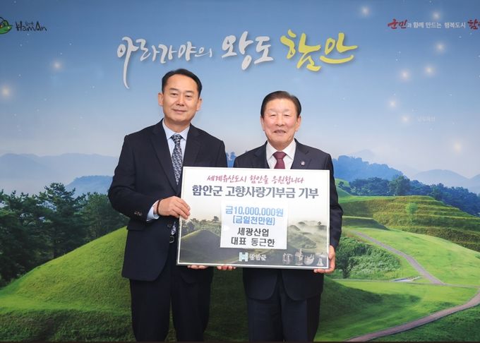[경남도민뉴스=권중환 기자] 함안군은 4일 군북면 소재 기업 세광산업 동근한 대표가 함안군에 고향사랑기부금 1000만 원을 기탁했다고 밝혔다.