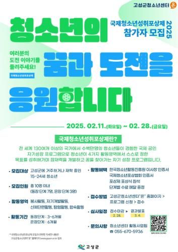 [경남도민뉴스=김태수 기자] 고성군청소년센터“온”은 오는 2월 11일부터 28일까지 국제청소년성취포상제 동장·은장 단계에 참여할 청소년 10명을 모집한다.