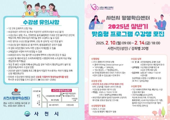 [경남도민뉴스=변정형 기자] 사천시 평생학습센터는 2월 10일부터 14일까지 ‘2025년 상반기 맞춤형 프로그램 수강생’을 모집한다고 6일 밝혔다.
