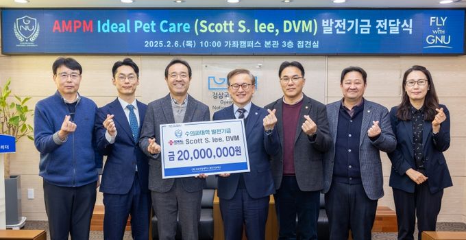 [경남도민뉴스=권중환 기자] 경상국립대학교는 미국 ‘AMPM Ideal Pet Care(에이엠피엠 아이디얼 동물병원)’의 이시경(Scott S. Lee) 원장이 대학발전기금 2000만 원을 기부했다고 밝혔다. 이시경 원장은 2022년 12월 1000만 원, 2023년 12월 2000만 원을 기부한 데 이어 이번에 다시 2000만 원을 기부했다.