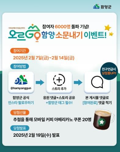 참여는 함양군의 공식 인스타그램 계정에서 ‘오르GO 함양’ 관련 홍보 게시물을 공유하고 댓글을 남기면 응모할 수 있으며, 19일 추첨을 통해 선정된 50명에게 모바일 커피 쿠폰이 제공된다.