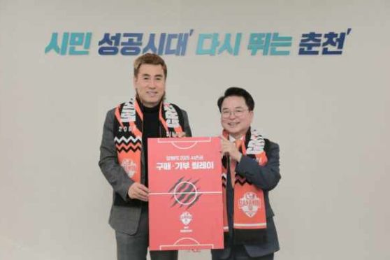육동한 춘천시장이 6일 김병지 강원특별자치도민프로축구단(이하 강원FC) 대표이사와 함께 강원FC 시즌권 구매 및 기부 릴레이에 동참했다.