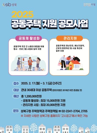 [경남도민뉴스=윤장희 기자] 서울 성북구가 ‘2025년 공동주택 지원사업’을 공모한다.