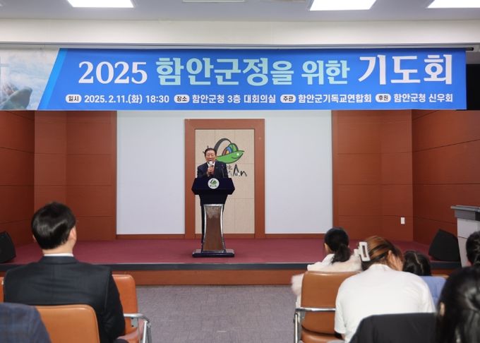 [경남도민뉴스=권중환 기자] 함안군은 지난 11일 오후 6시 30분, 군청 3층 대회의실에서 조근제 함안군수를 비롯해 기독교 관계자, 주민 등 200여 명이 참석한 가운데 ‘2025년 함안군정 기도회’를 개최했다.