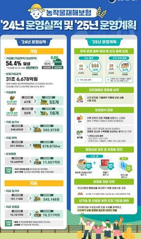 ‘농작물재해보험’은 태풍, 우박, 집중호우, 동상해 등 자연재해와 조수해, 화재로 인한 농작물 및 시설 피해 발생 시 일정 부분을 보상해 주는 보험으로 예측하기 곤란한 기상이변이 날로 증가함에 따라 안전한 영농활동 보장과 농가 경영불안 해소를 위해 농가에 꼭 필요한 보험이다.
