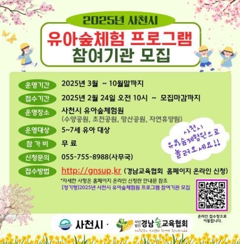 [경남도민뉴스=변정형 기자] 사천시는 관내 조성된 유아숲체험원(수양공원, 망산공원, 초전공원, 자연휴양림)에서 맞춤형 숲체험 프로그램을 3월부터 10월까지 운영한다.