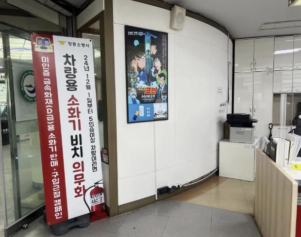 [경남도민뉴스=최인태 기자] 장흥소방서는 차량용소화기 의무비치 홍보를 위해 장흥군청 민원실에 홍보배너를 비치했다고 18일 밝혔다. 차량용소화기 관련 법은 2021년 개정됐으며 3년 유예기간이 종료됨에 따라 2024년 12월 1일 이후부터 의무적으로 차량에 비치해야한다. 차량 운전자의 초기 화재 대응능력을 강화하기 위해 도입된 법적 요구사항이다. 이에 따라, 장흥소방서는 이번 홍보배너를 통해 군민들에게 차량용소화기의 중요성과 의무 비치에 대한 내용을 적극적으로 알리고 있다.