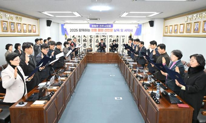 [경남도민뉴스=권중환 기자] 진주시의회는 19일 제262회 임시회를 앞두고 청렴한 의정 실천을 위한 ‘2025 함께하는 청렴결의 선언문 낭독 및 서약식’을 진행했다.