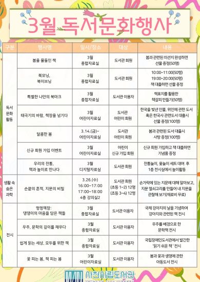 [경남도민뉴스=변정형 기자] 사천시립도서관은 2025년 3월, 봄을 맞이해 시민들에게 풍성한 독서 경험과 학습의 기회를 제공하는 다양한 프로그램을 준비했다고 19일 밝혔다.