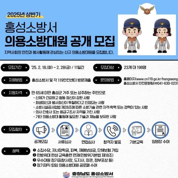 [경남도민뉴스=박만수 기자] 홍성소방서는 지역사회의 안전과 봉사활동에 관심 있는 2025년 상반기 신규 의용소방대원을 공개 모집한다고 밝혔다.