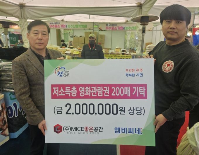 [경남도민뉴스=권중환 기자] 진주시복지재단은 ㈜마이스 좋은 공간(대표 위영수)에서 지역 내 어려운 이웃을 돕기 위한 롯데시네마 엠비씨네점 무료 영화관람권 200매(환가액 200만 원 상당)를 기탁했다고 20일 밝혔다.