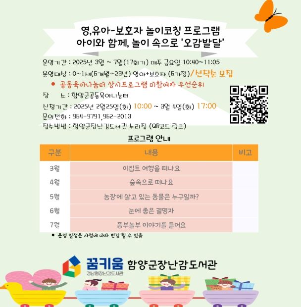 [경남도민뉴스=장광동 기자] 함양군은 오는 2월 25일부터 3월 4일까지(7일간) 장난감도서관 놀이코칭 프로그램 참여자를 모집한다.