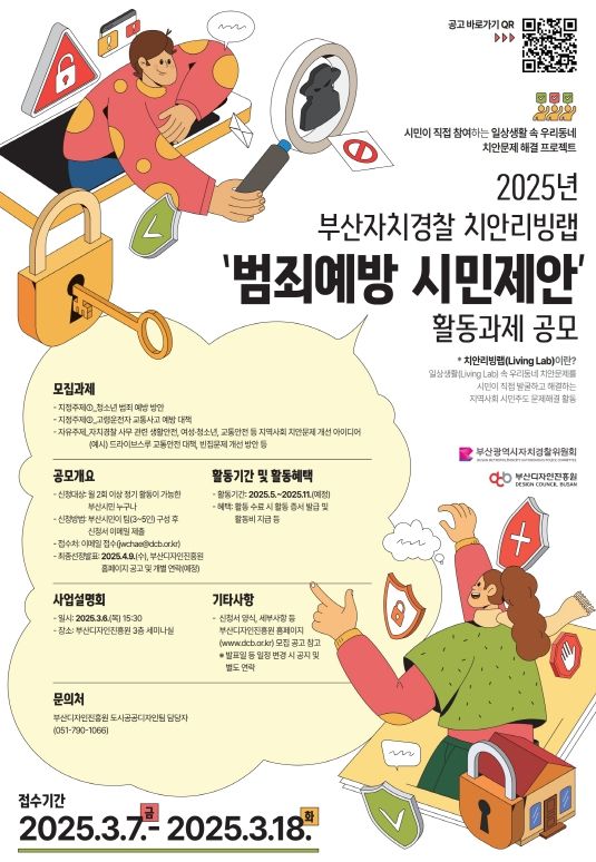 [경남도민뉴스=신석주 기자] 부산광역시 자치경찰위원회와 (재)부산디자인진흥원(원장 강필현)은 시민의 다양한 요구에 부응하는 치안서비스를 발굴하기 위한 '2025년 부산자치경찰 치안리빙랩 범죄예방 시민제안 활동과제'를 공개 모집한다고 24일 밝혔다.