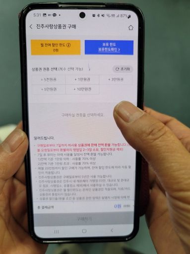 모바일 진주사랑상품권은 1인당 월 20만 원 한도 내에서 7% 선할인을 받고 제로페이앱에서 구매할 수 있으며, 선물 한도는 월 40만 원, 보유 한도는 150만 원이다.