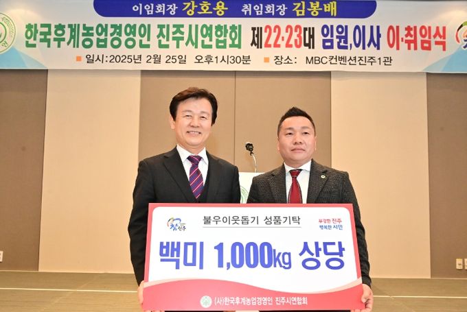 이날 행사에는 조규일 진주시장, 한농연 진주시연합회 임원 및 유관기관 단체장 등 100여 명이 참석했으며, 재임기간 동안 농업발전을 위해 최선을 다한 강호용 이임 회장에 대한 공로패 전달, 취임하는 김봉배 신임 회장의 취임사, 회기 전달 및 성품시탁식(백미 1,000㎏) 등으로 진행됐다.