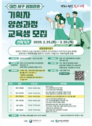 교육 기간은 3월 25일을 시작으로 4월 8일까지 총 6차시 21시간으로 진행될 예정이며, 대전 서구의 관광자원 및 공정관광에 관심이 있는 자라면 누구나 지원할 수 있다.