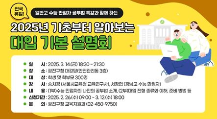 [경남도민뉴스=윤장희 기자] 광진구가 다음 달 14일, 학생 및 학부모를 대상으로 ‘2025년 기초부터 알아보는 대입 기본 설명회’를 개최한다.