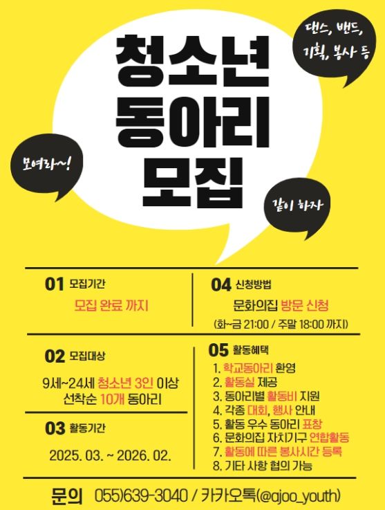 아주청소년문화의집 소속 청소년동아리에 대한 궁금한 사항은 전화 또는 카카오톡으로 문의하면 된다.