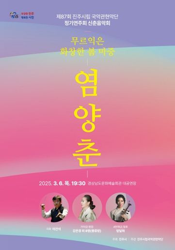이번 정기연주회는 진주시립국악관현악단 이건석 상임지휘자의 지휘에 맞춰‘무르익은 화창한 봄 마중 - 염양춘’을 주제로, 1부 전통국악과 2부 창작음악으로 나누어 신춘음악회로 진행된다.