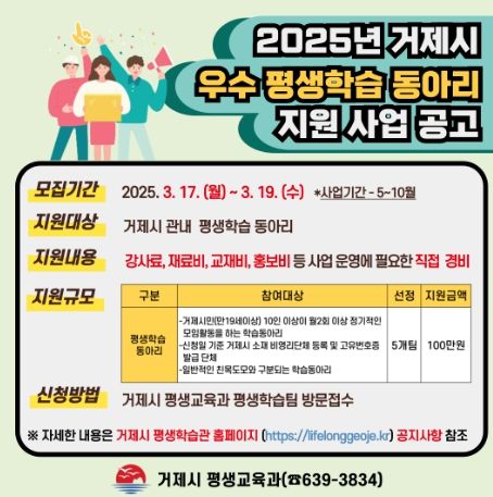 [경남도민뉴스=김부경 기자] 거제시가 지역사회 학습공동체 형성과 배움문화를 조성하기 위해 ‘2025년 거제시 우수 평생학습 동아리 지원사업’을 실시한다.