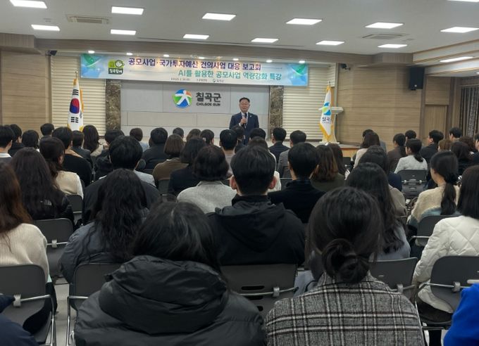 [경남도민뉴스=최민숙 기자] 칠곡군은 지난 26일 군청 강당에서‘공모사업 및 국가투자예산 건의사업 대응 보고회’와‘AI를 활용한 공모사업 기획 역량 향상 특강’을 개최했다.
