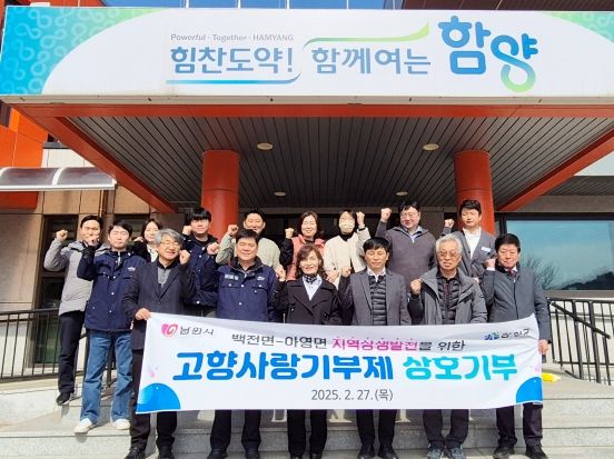 [경남도민뉴스=장광동 기자] 함양군 백전면과 전북 남원시 아영면은 27일 백전면사무소에서 양 기관 면장 등 10여 명이 참석한 가운데 고향사랑기부금 상호 기부 행사를 가졌다.