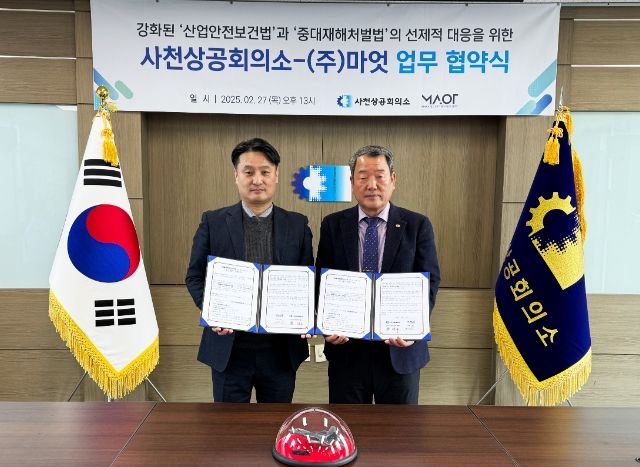 [경남도민뉴스=변정형 기자] 사천상공회의소(회장 황태부)는 지난 27일 ㈜마엇과 ′디지털 위험성평가 시스템′ 구축지원 업무협약을 체결했다고 28일 밝혔다.