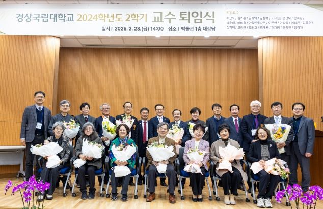 [경남도민뉴스=권중환 기자] 경상국립대학교는 2월 28일 오후 2시 가좌캠퍼스 박물관 1층 대강당에서 ‘2024학년도 2학기 교수 퇴임식’을 개최했다. 이날 행사는 후학 양성과 대학 발전을 위해 커다란 발자취를 남기고 정년을 맞이하여 퇴직하는 교수들의 공로를 기리기 위해 마련됐다.