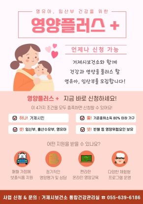 [경남도민뉴스=김부경 기자] 거제시가 2025년 영양플러스사업의 신규 대상자를 모집한다. 임산부(임신부, 출산부, 수유부)와 영유아(0~5세, 72개월 이하)를 대상으로 보충식품을 지원하고 영양교육을 제공해 건강한 식생활을 돕는 사업이다.