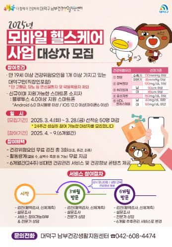 [경남도민뉴스=도문호 기자] 대전 대덕구가 ‘2025년 모바일 헬스케어 사업’의 신규 대상자를 오는 28일까지 선착순 모집한다고 4일 밝혔다.