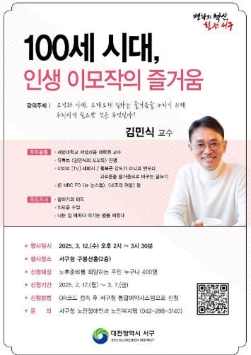 [경남도민뉴스=도문호 기자] 대전 서구는 3월 12일 신중년을 대상으로 ‘100세 시대, 인생 이모작의 즐거움’을 주제로 노후 준비 지원 특강을 개최한다.