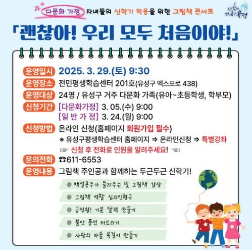 이번 콘서트는 유성구 다문화 가정의 유아 및 초등학생의 안정적인 신학기 적응을 돕기 위해 가족과 함께하는 특강으로 그림책 토크 콘서트 형식으로 진행된다.