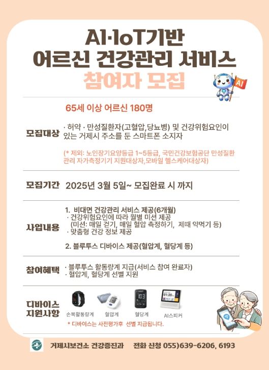 [경남도민뉴스=김부경 기자] 거제시보건소는 오는 4월부터 9월까지 65세 이상 어르신 대상으로 추진되는AI·IoT기반 어르신 건강관리사업 참여자를 선착순으로 180명 모집한다.
