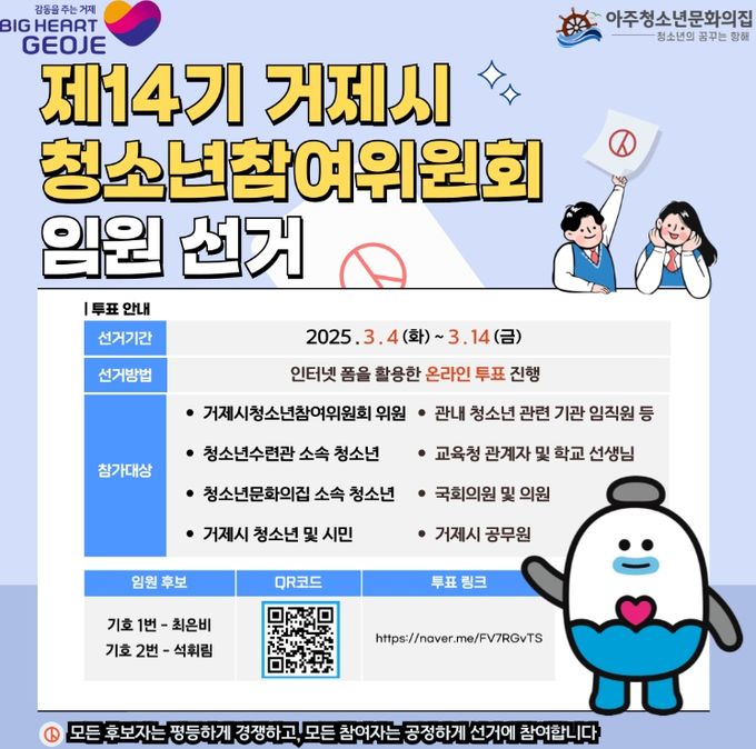 [경남도민뉴스=김부경 기자] 거제시는 3월 4일부터 3월 14일까지 제14기 거제시청소년참여위원회 활동을 주도해 나갈 임원 선거를 실시한다.
