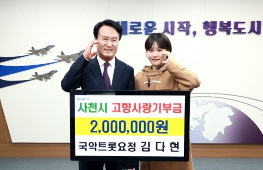 [경남도민뉴스=변정형 기자] 사천시는 국악트롯요정 김다현이 사천시청을 방문해 고향사랑기부금 200만 원을 전달했다고 4일 밝혔다.