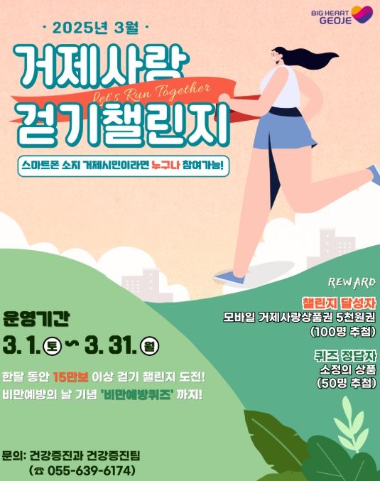 주민들이 꾸준히 걷기 운동에 참여할 수 있도록 걸음 수 달성, 코스따라 걷기 운동 등 월별 다양한 챌린지를 진행하고 달성자에게 추첨을 통해 모바일 거제사랑 상품권을 제공할 예정이다.