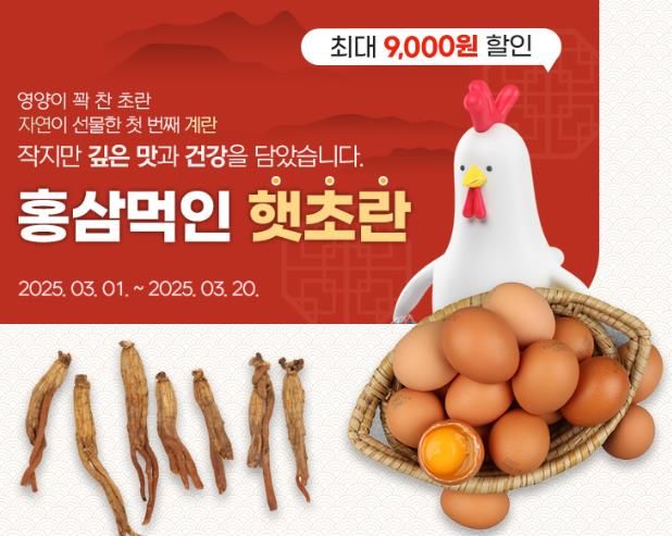 이번 할인 행사에서는 홍삼을 먹인 신선한 햇 초란을 최대 9000원까지 할인된 가격으로 제공하여 고객들의 큰 호응이 기대된다.