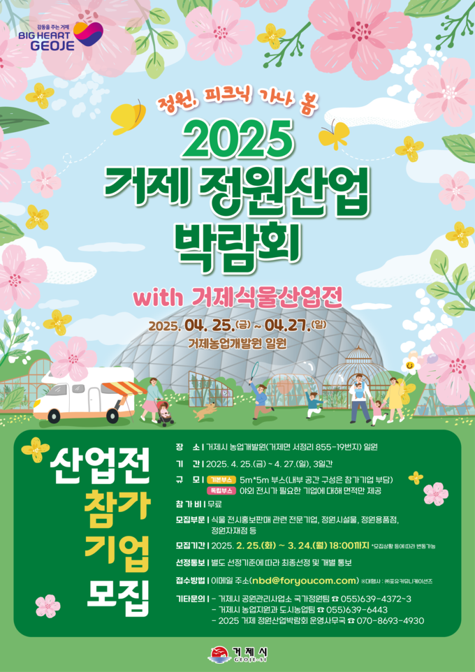 올해는 2025 거제정원산업박람회 참가기업 모집과 병행하고 있어 자세한 사항은 거제시 홈페이지의 고시/공고 게시판을 참조하거나 거제시 농업지원과 도시농업팀으로 문의하면 된다.