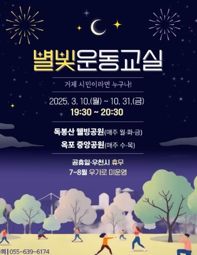 [경남도민뉴스=김부경 기자] 거제시 보건소는 바쁜 일상으로 낮시간 운동이 어려운 지역 주민의 규칙적인 신체활동 실천을 돕기 위해 저녁 시간을 활용한 ‘2025년 별빛 운동교실’을 오는 3월 10일부터 10월 31일까지 운영한다고 밝혔다.